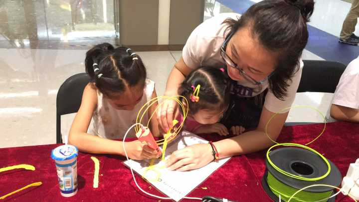 “3D·啟智·童(同)樂”展區(qū)主要結(jié)合“六一”主題和三祺廣場(chǎng)“新教育”的區(qū)位優(yōu)勢(shì),開展面向兒童的3D打印科普親子體驗(yàn)活動(dòng)。無論是3D打印筆區(qū)域、3D打印機(jī)區(qū)域都內(nèi)容豐富,過程有趣,吸引了絡(luò)繹不絕的人群圍觀,尤其是3D打印煎餅和巧克力成了大家的注腳點(diǎn),邊看邊嘖嘖稱奇。孩子們可以體驗(yàn)DIY美食的樂趣,可以實(shí)現(xiàn)畫出立體的圖畫,傳遞了科普的知識(shí)性、實(shí)用性和趣味性,大人和小孩樂在其中,從而激發(fā)了孩子們愛思考、樂創(chuàng)造、勤動(dòng)手等的良好品質(zhì)。