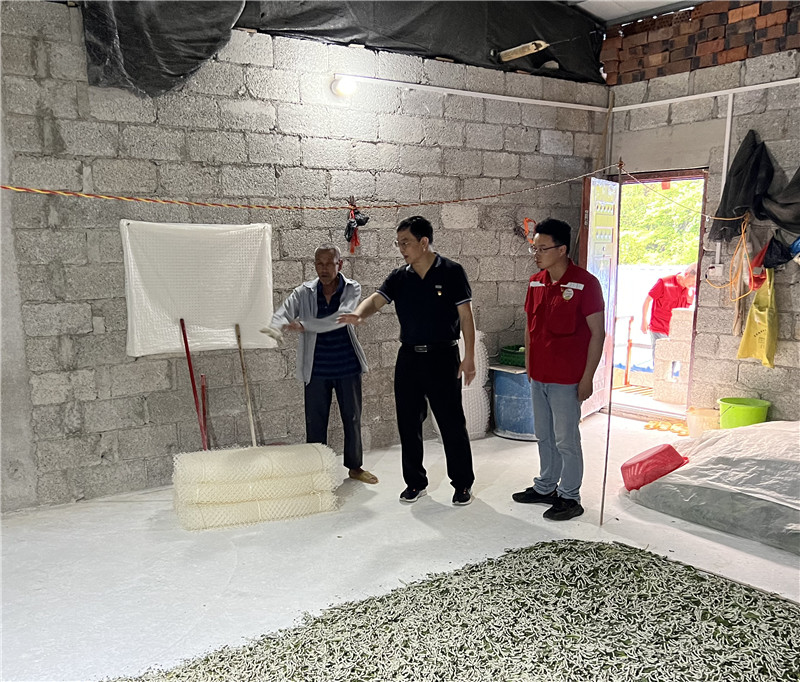 在走訪峰洋村各漏屯集中養(yǎng)蠶點(diǎn)的過程中,景東平副董事長詳細(xì)詢問了蠶房租金、養(yǎng)殖規(guī)模和產(chǎn)值等情況,了解到峰洋村通過建造蠶房租賃給蠶農(nóng),已經(jīng)形成每年2-3萬元的村集體收益,同時也滿足了蠶農(nóng)發(fā)展養(yǎng)殖業(yè)產(chǎn)業(yè)的場地需求,他表示這是互利互惠的好思路好做法,要持續(xù)進(jìn)行下去。景東平副董事長還叮囑駐村幫扶干部做好產(chǎn)業(yè)政策宣傳,和后盾單位要密切配合,幫助農(nóng)戶拓寬產(chǎn)品銷路,提升“自我造血”功能,將峰洋村桑蠶產(chǎn)業(yè)做優(yōu)做強(qiáng)。